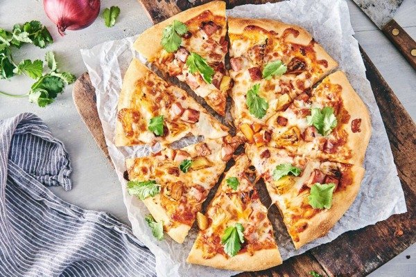 • Hawaiian pizza with ham, pineapple, and mozzarella